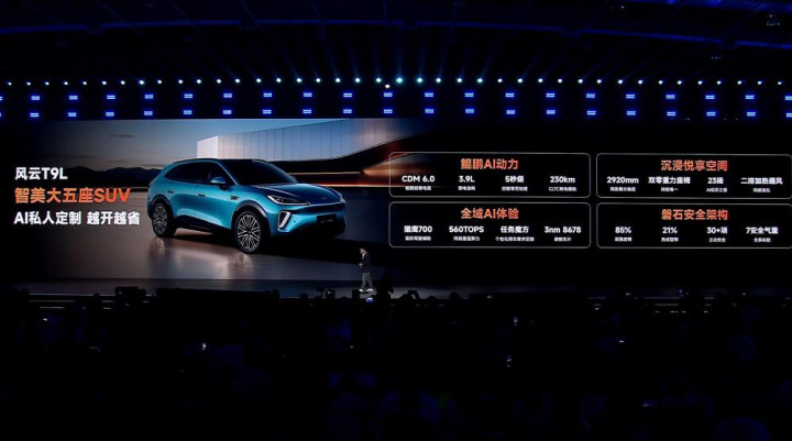 其中大五座SUV风云T9L继广州车展正式亮相后开启盲订,车辆搭载鲲鹏AI超能电混 CDM 6.0和猎鹰700,支持鲲鹏AI能量管理,并且支持AI私人定制,打造独特的驾乘体验。